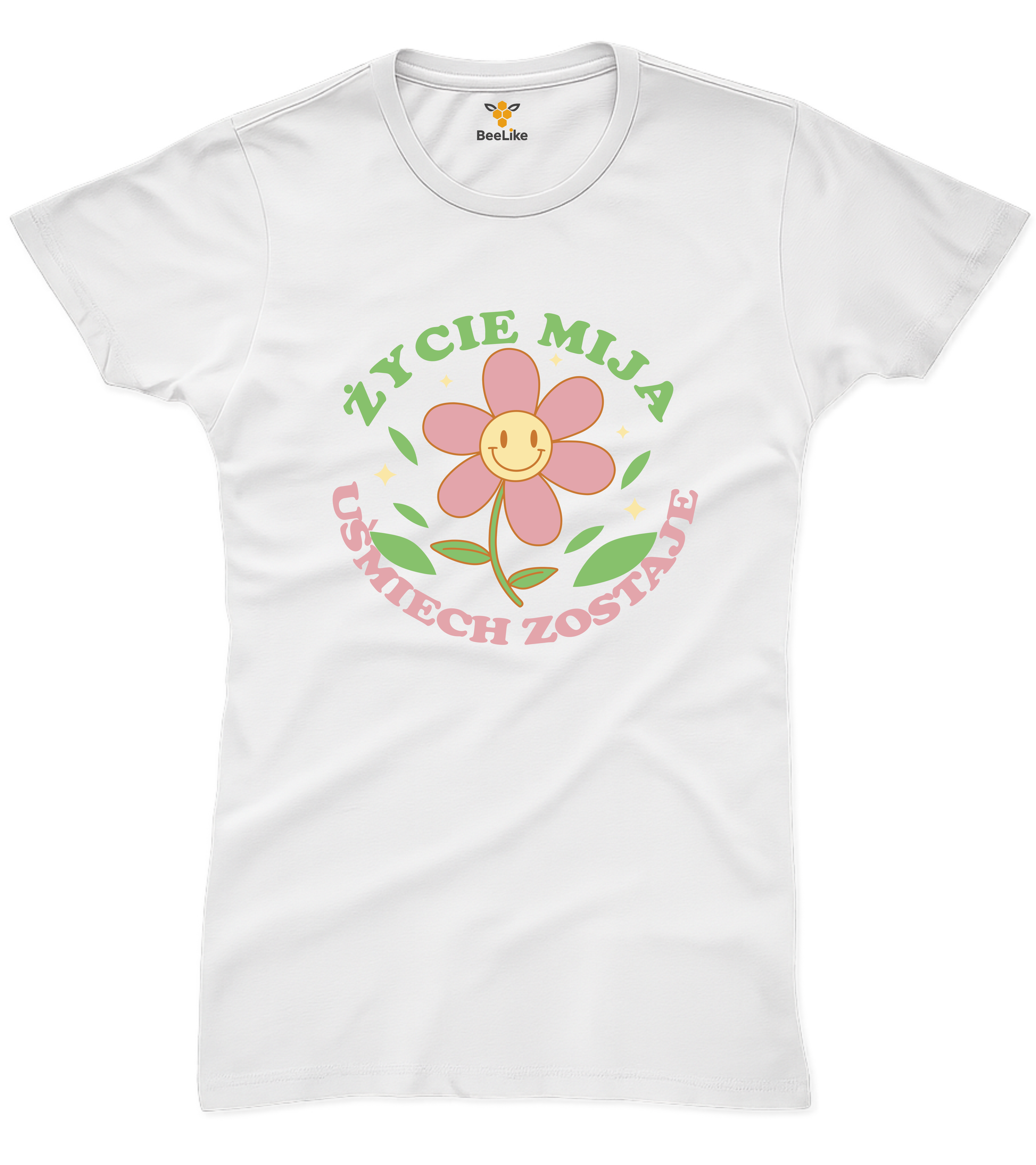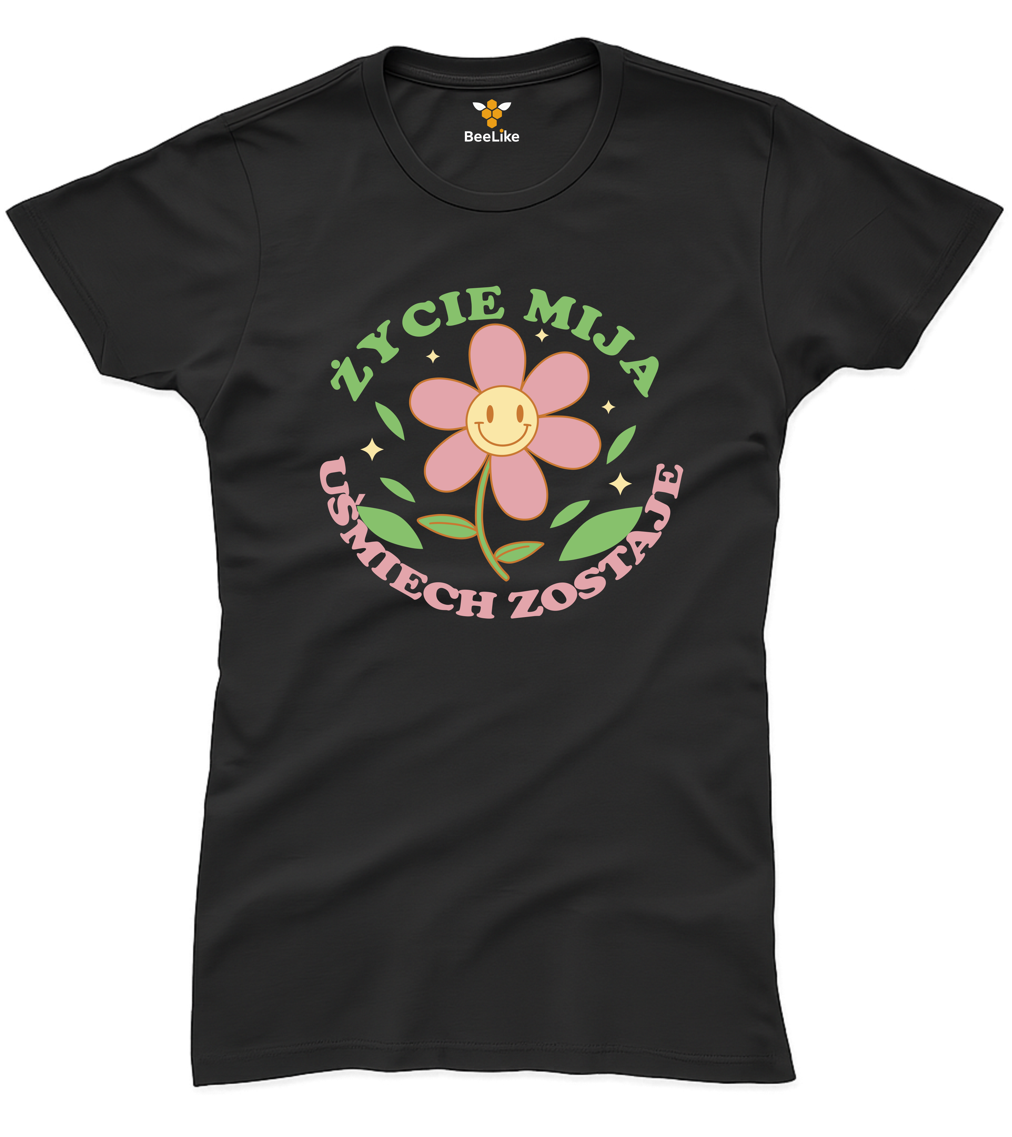Koszulka damska "Życie mija uśmiech zostaje" to pozytywny przekaz z uśmiechniętym kwiatkiem.