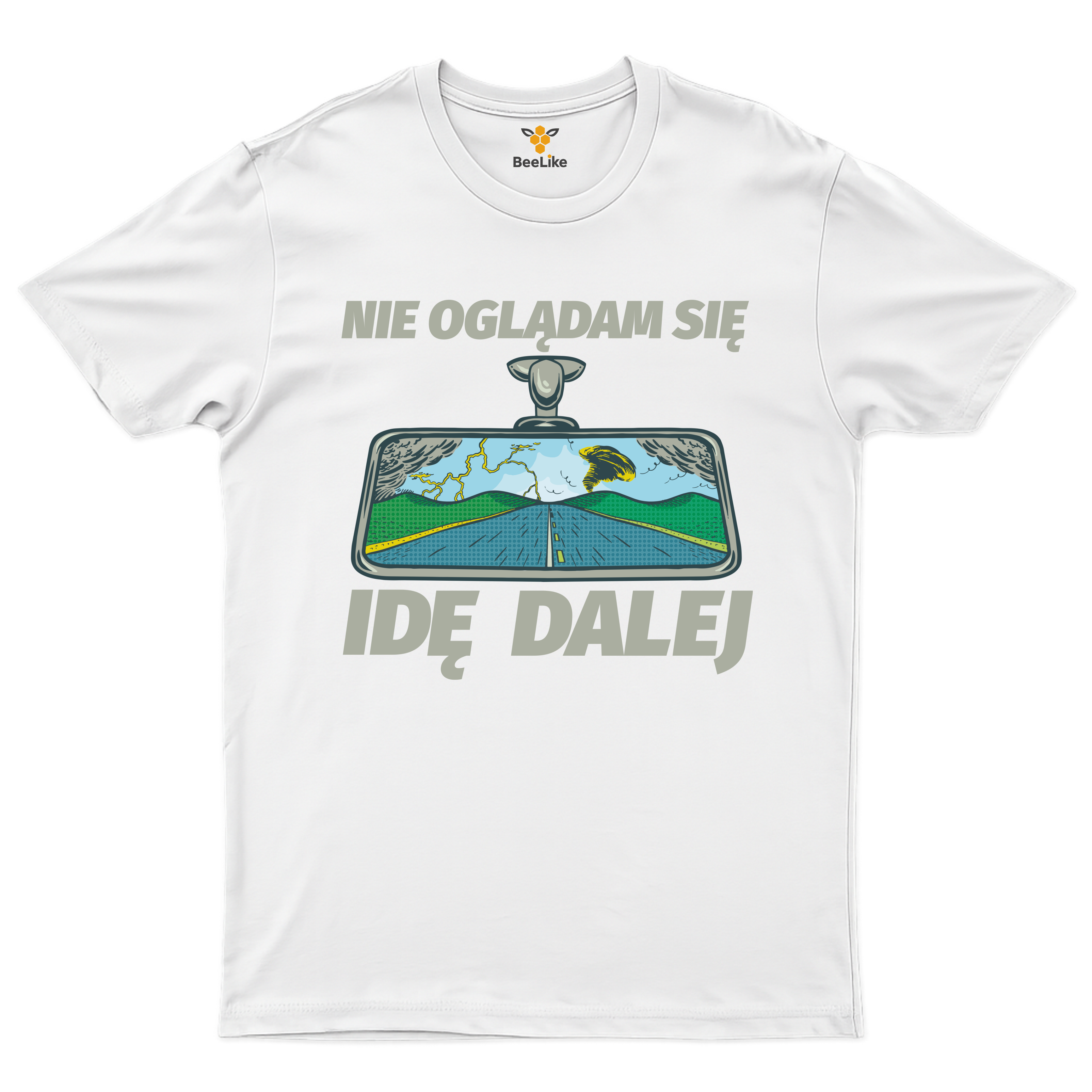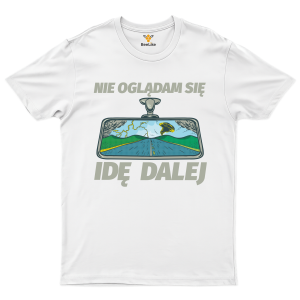 Koszulka męska "Nie oglądam się, idę dalej" to manifest determinacji! Grafika drogi z lusterkiem wstecznym przypomina, że przeszłość została za Tobą. ✓ 100% bawełna 190g ✓ Klasyczny krój ✓ Rozmiary S-4XL ✓ Polska produkcja. Motywacyjny prezent dla każdego!