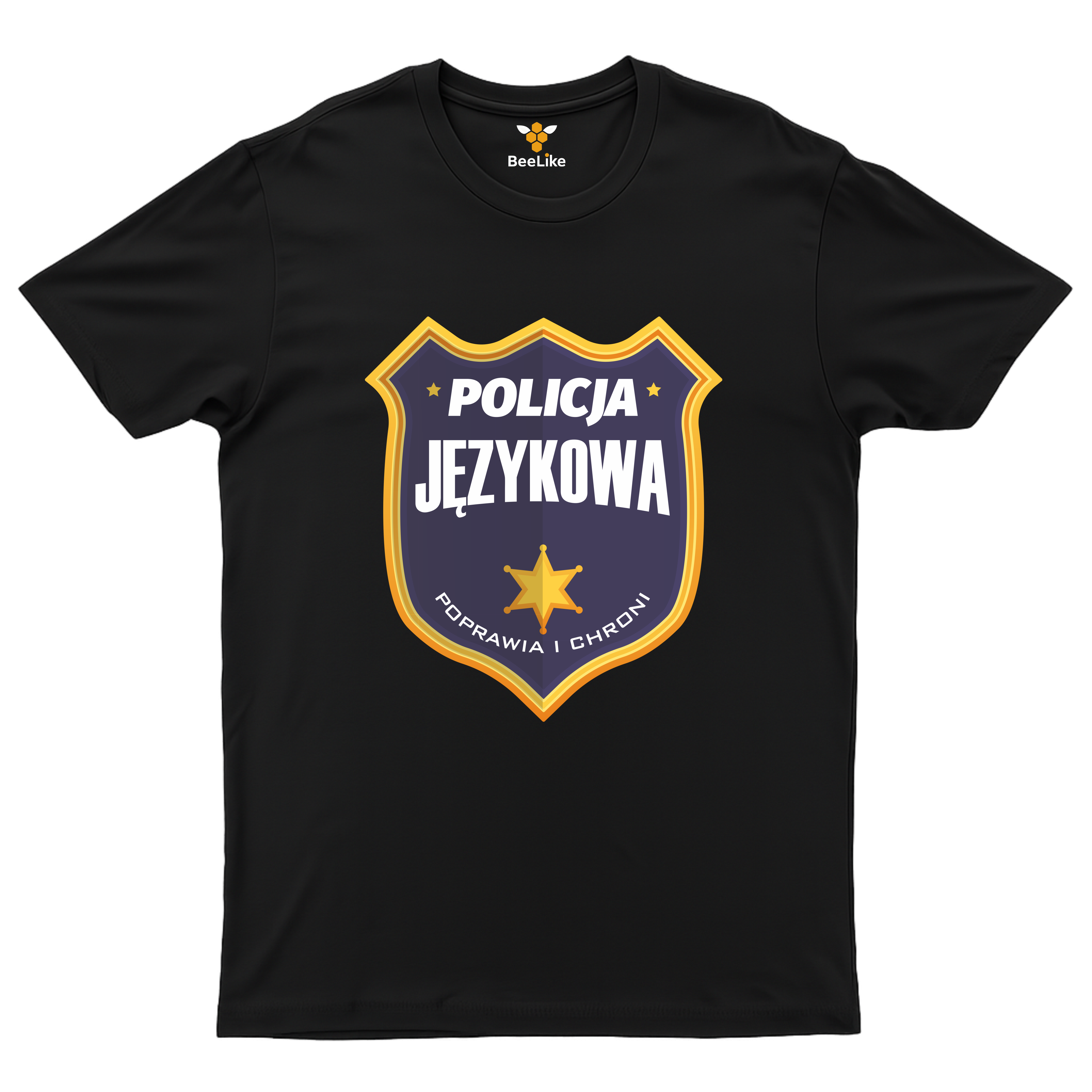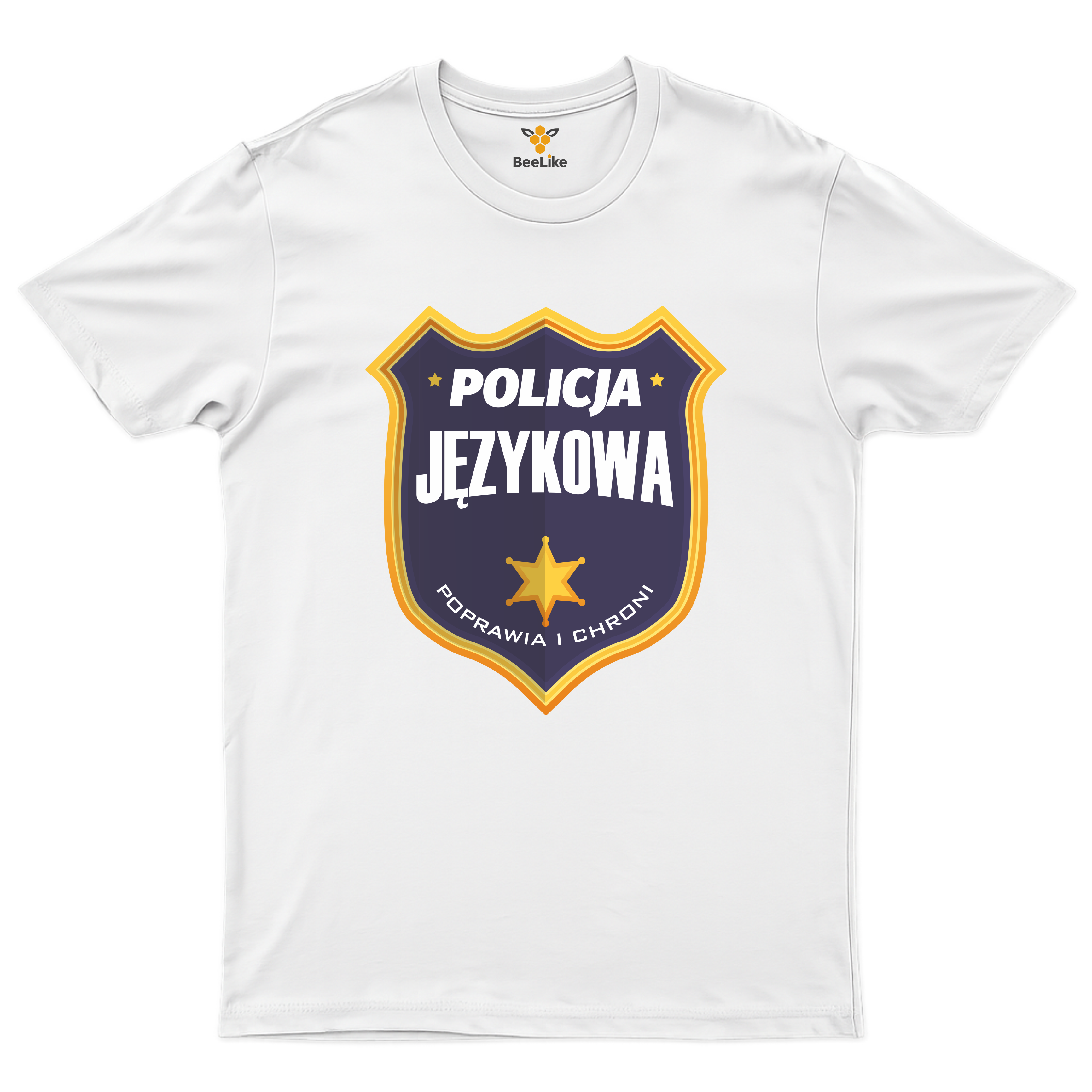 Koszulka „Policja Językowa – poprawia i chroni” to humorystyczna koszulka z nadrukiem dla osób dbających o poprawność językową. Koszulka z zabawnym napisem i grafiką tarczy policyjnej idealnie sprawdzi się jako prezent dla nauczyciela języka polskiego, polonisty, korektora, copywritera lub miłośnika poprawnej polszczyzny. Stylowa koszulka męska z nadrukiem łączy inteligentny humor, minimalistyczny design i aktualny temat językowy.