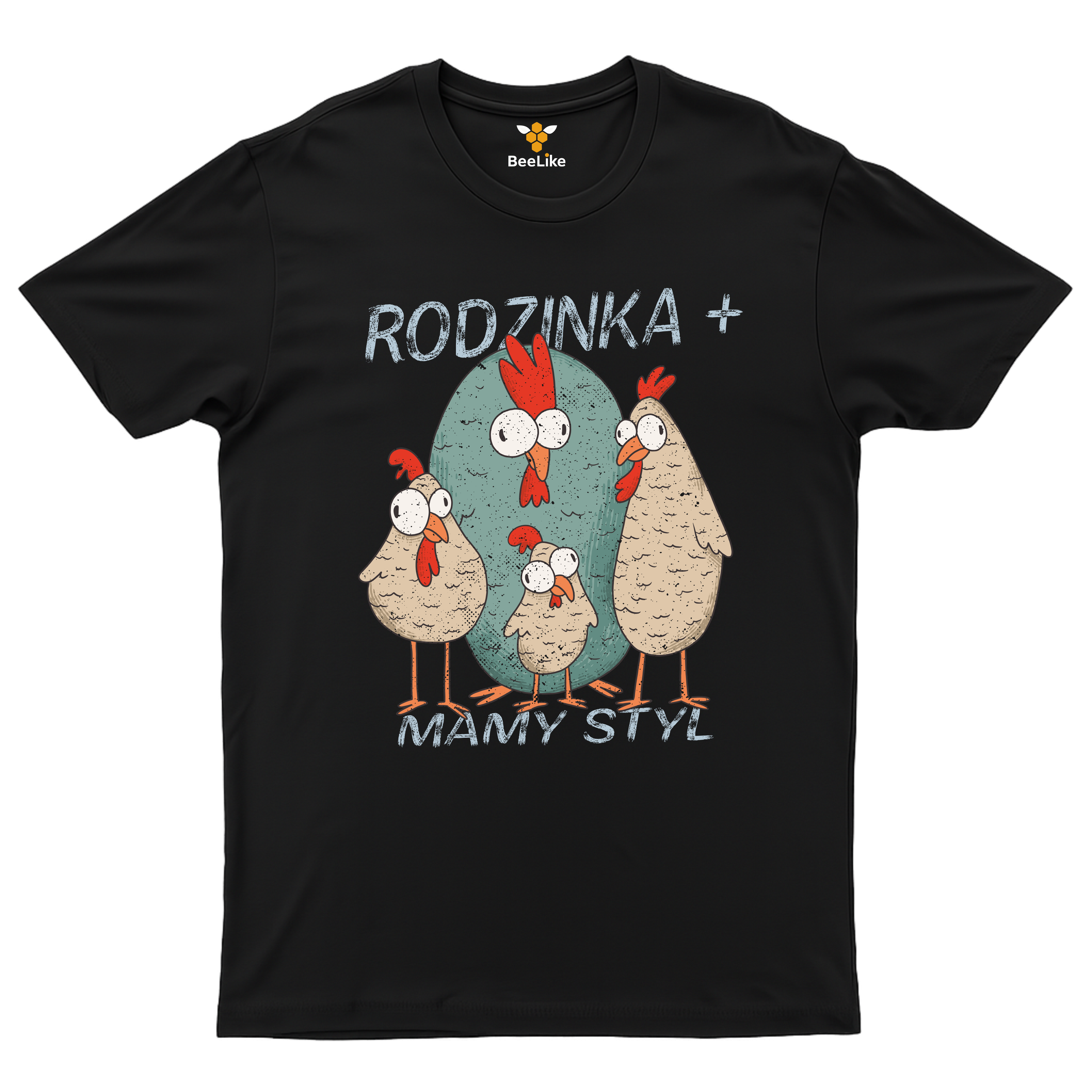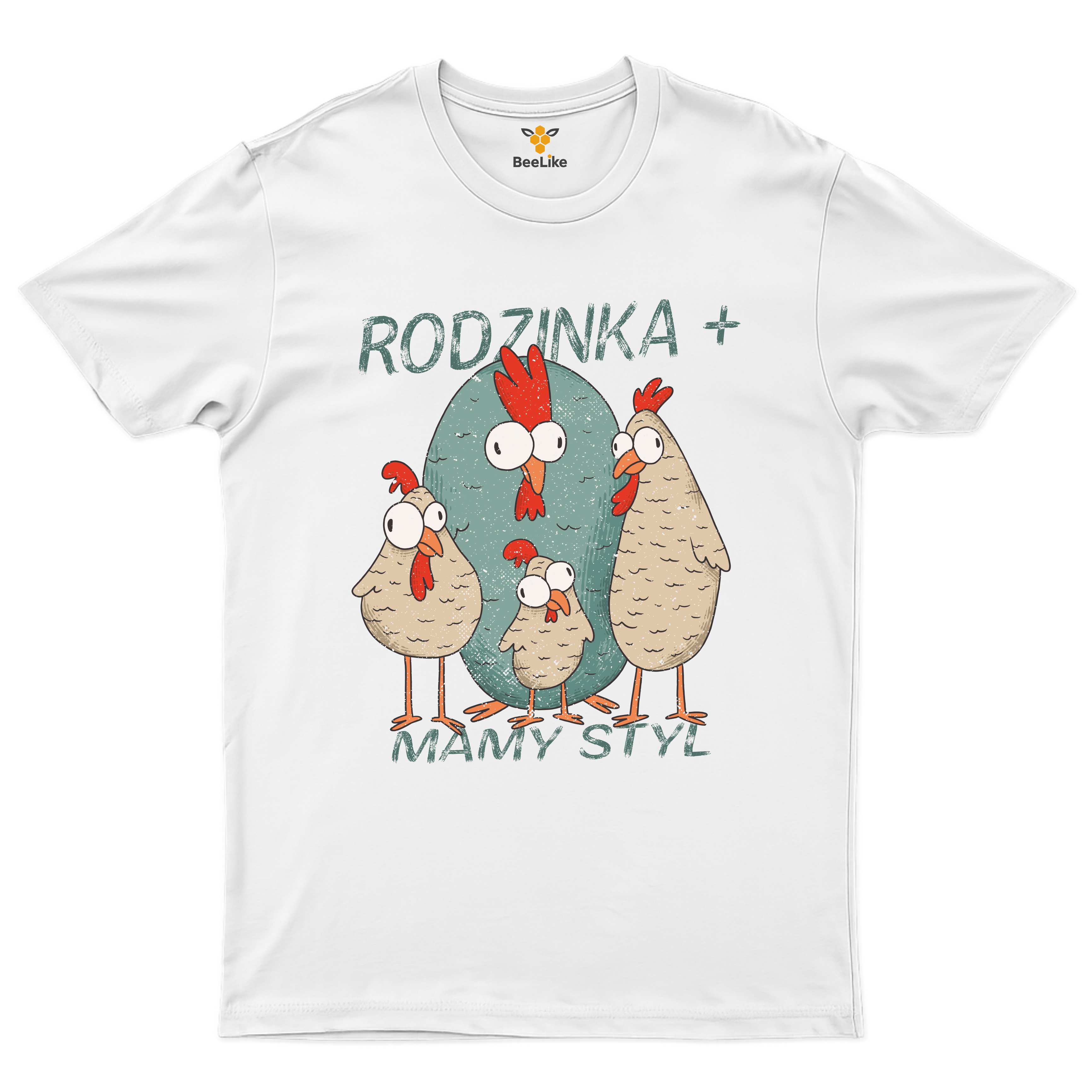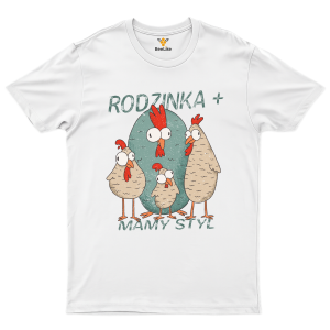 Ta koszulka to prawdziwy manifest rodzinnego życia pełnego ciepła, humoru i miłości! Grafika przedstawia uroczą rodzinkę kurczaków z napisem "RODZINKA + MAMY STYL" – to zabawna metafora ojcostwa, życia rodzinnego i codziennych przygód z dziećmi. Kurczaki z wielkimi oczami symbolizują dzieci, które nieustannie potrzebują uwagi, a mama (i tata!) są centrum ich świata.