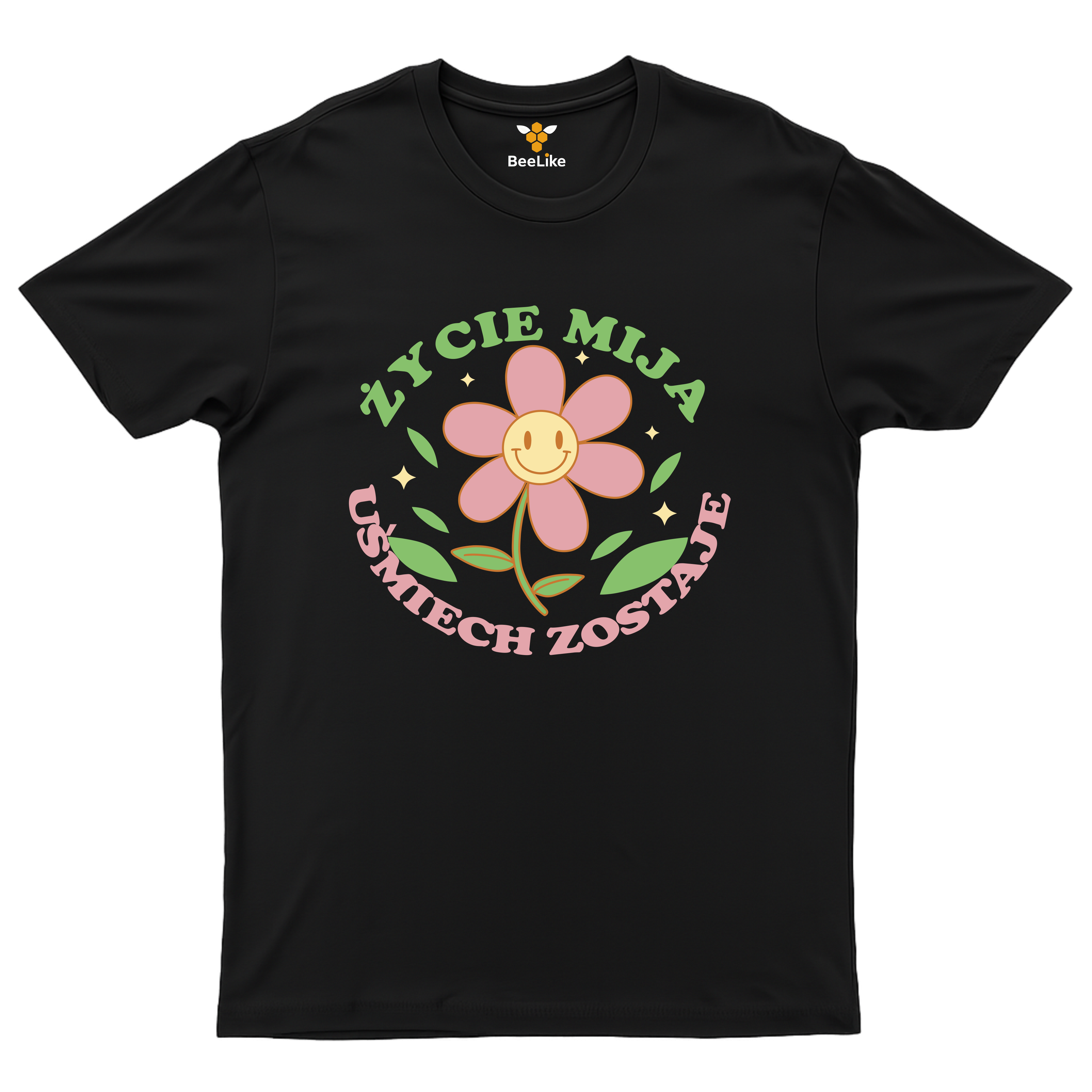 Koszulka męska "Życie mija uśmiech zostaje" to pozytywny przekaz z uśmiechniętym kwiatkiem.